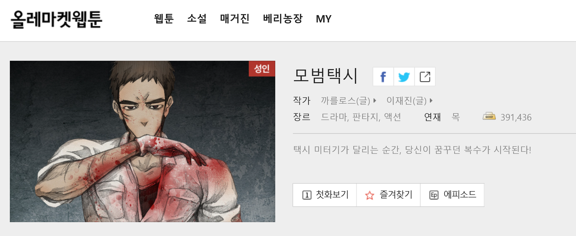 모범택시 작가 까를로스, 크크재진 총편수 총 106화 택시 미터기가 달리는 순간, 당신이 꿈꾸던 복수가 시작된다!